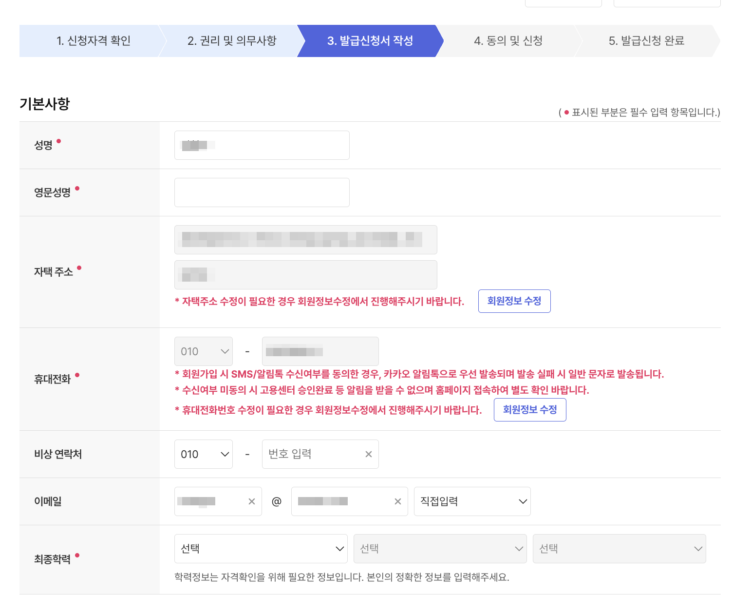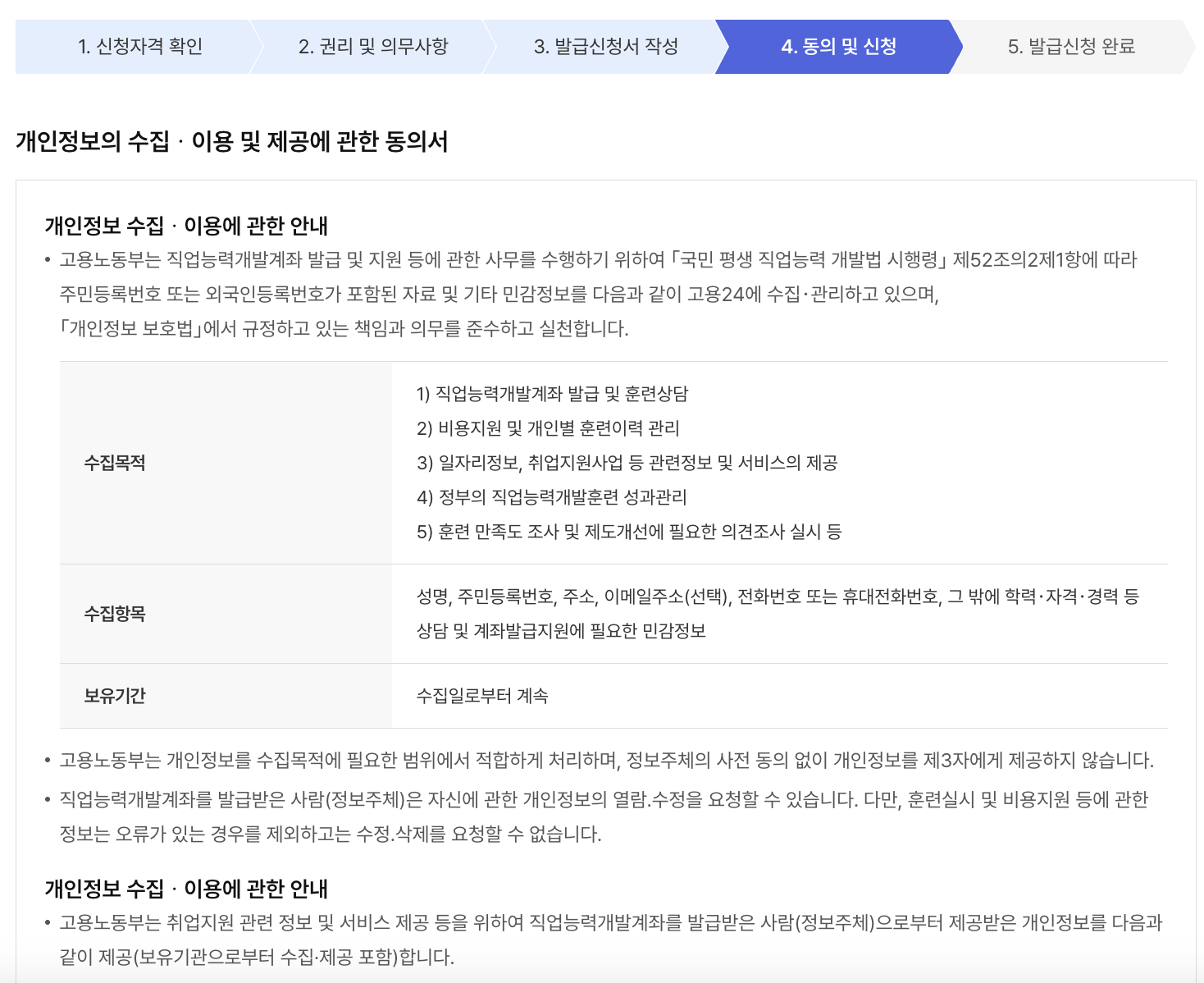 (1) 구직신청 (2) 신청자격확인 > 2. 권리 및 의무사항 > 3. 발급신청서 작성 > 4. 동의 및 신청