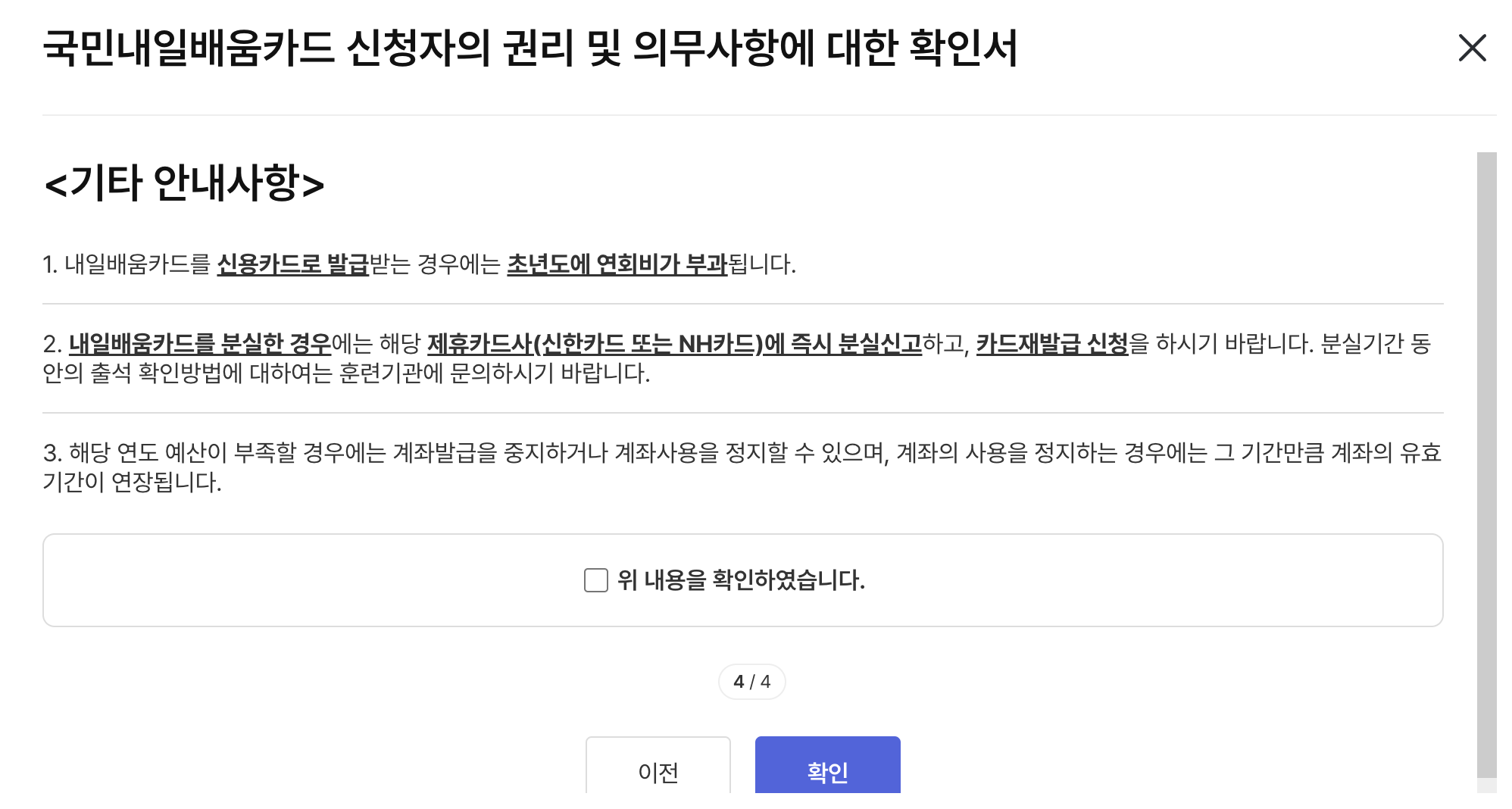 - 국민내일배움카드를 발급받아 수강하고자 하는 훈련 이외에 정부(지자체 포함)로부터 훈련비를 지원받는 훈련과정을 수강하거나 수강할 계획이 있는 경우