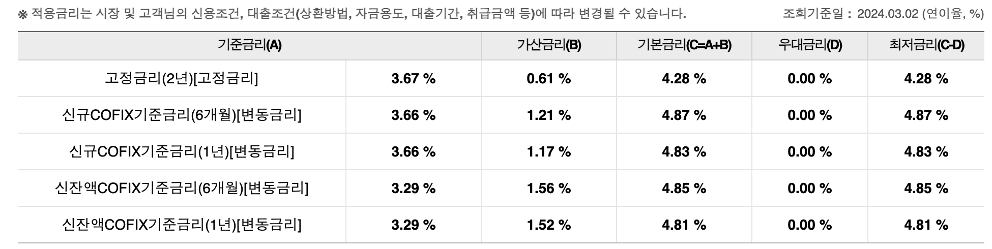 대출금리는 기준금리에 따라 달라집니다. 금리유형은 변동기준금리 / 은행내부신용등급 CSS3등급/ 대출기간 24개월, 만기상환방식, 자금용도는 신규임차자금, 대출금액은 2억 원 기준입니다.