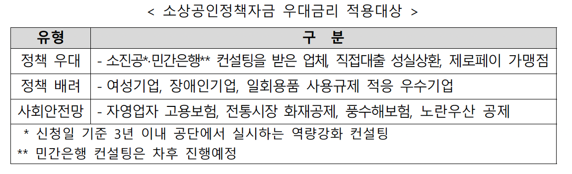 - 우대금리 : 정책우대, 정책배려, 사회안정망 이용 소상공인 3가지 유형으로 구분