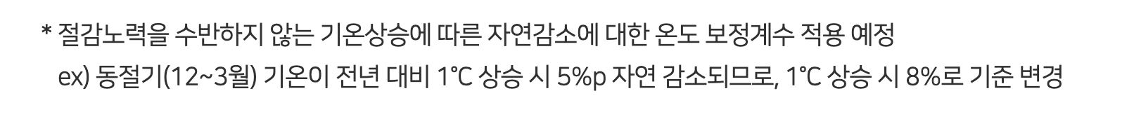 (ex) 동절기(12~3월) 기온이 평년기온 대비 1°C 상승 시 5% p 자연 감소되므로, 1°C 상승 시 8%로 기준 변경)