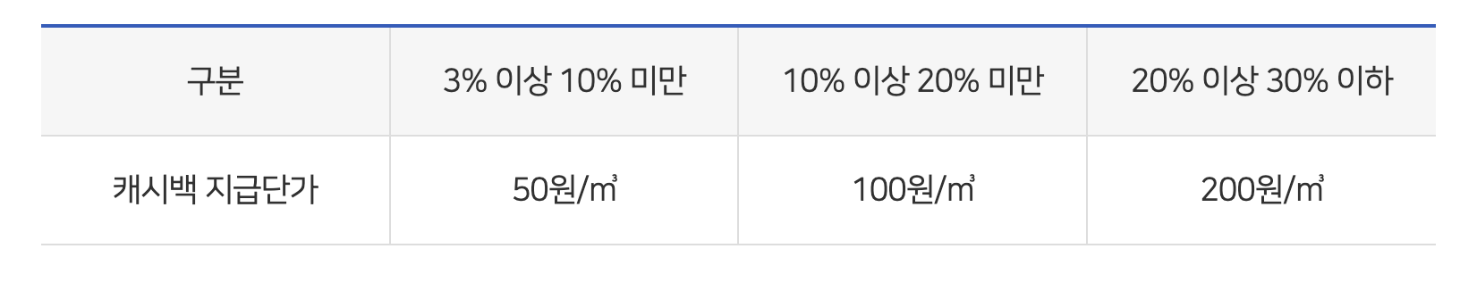 ✓ 동절기(12월~3월) 동안 전년 동기간 대비 3% 이상 절감 시 절감량에 따라 절감률 별로 차등 캐시백 지급 (30%한도, 10원 단위 절사)